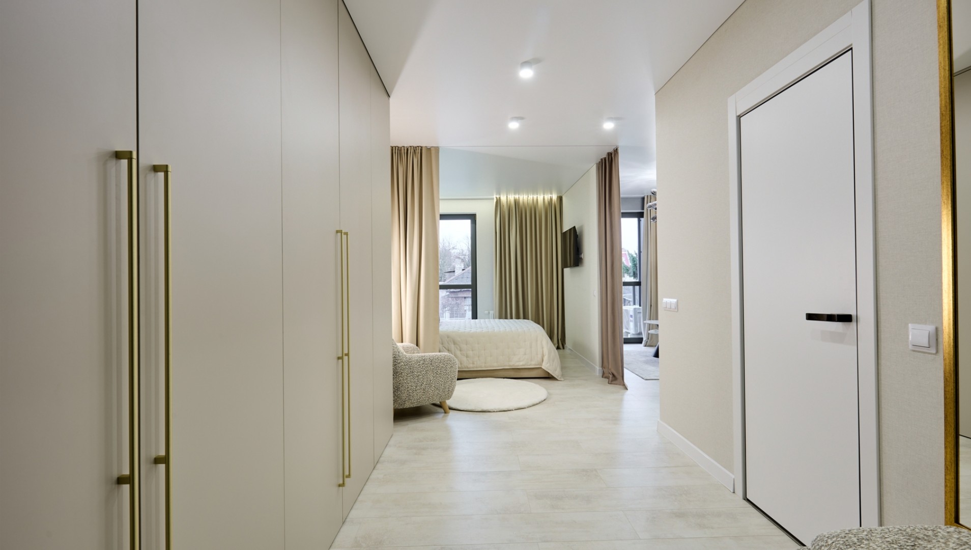 Mieszkanie-studium, urządzone w modnym czarno-fioletowym kolorze, przykuje uwagę współczesnych i niebanalnych ludzi. Otwarta przestrzeń została umiejętnie podzielona na strefę kuchni i sypialni.